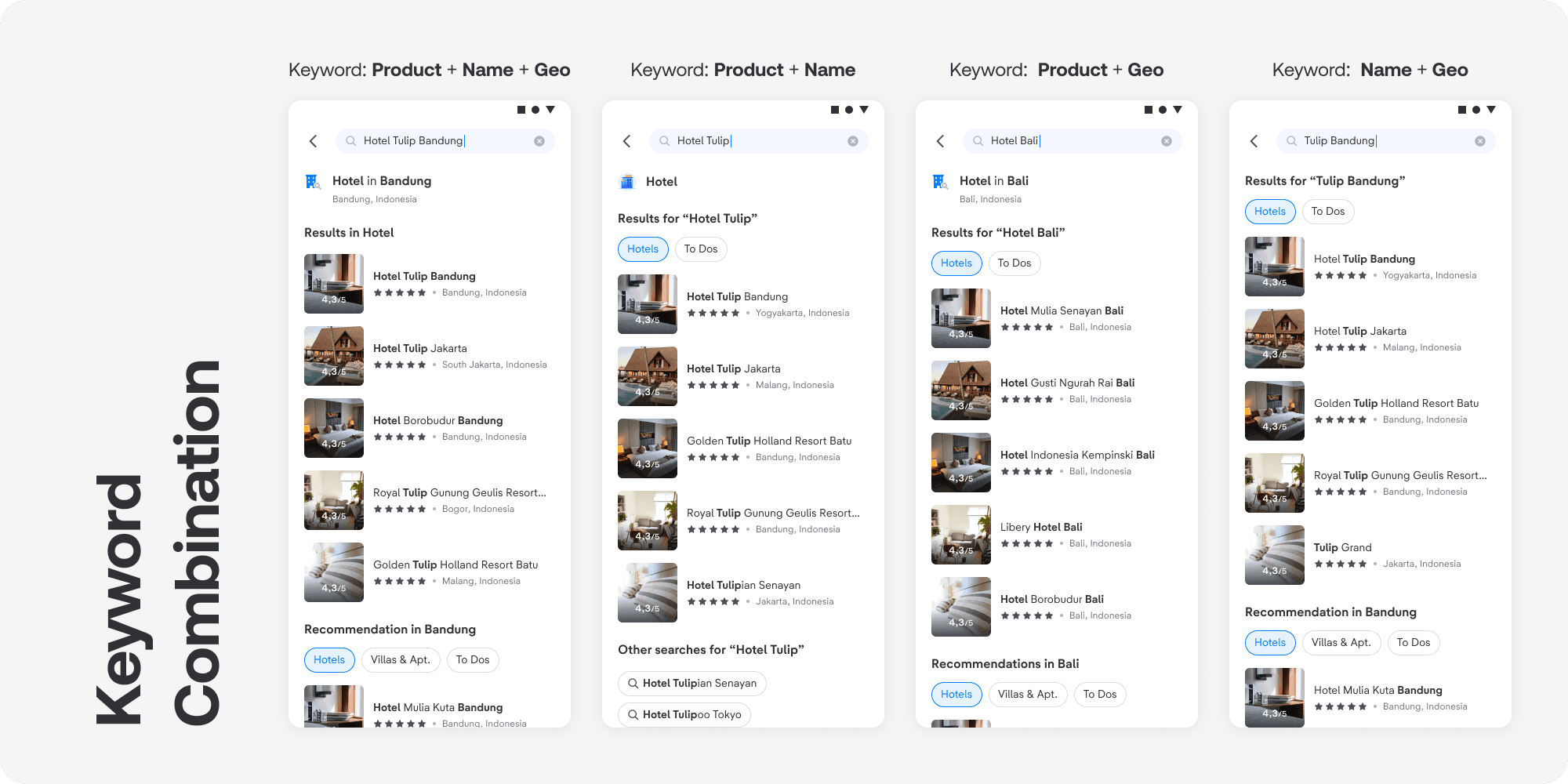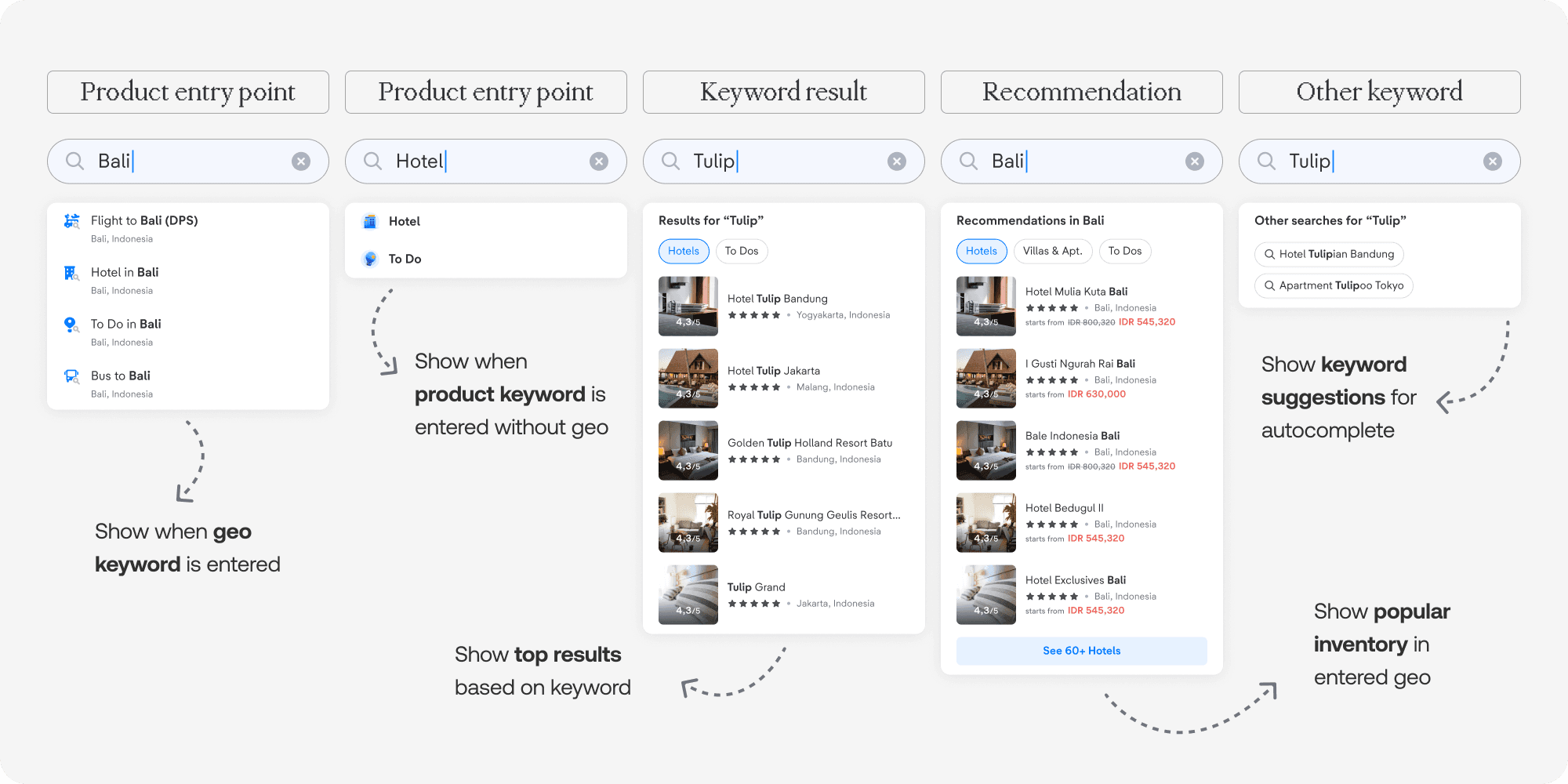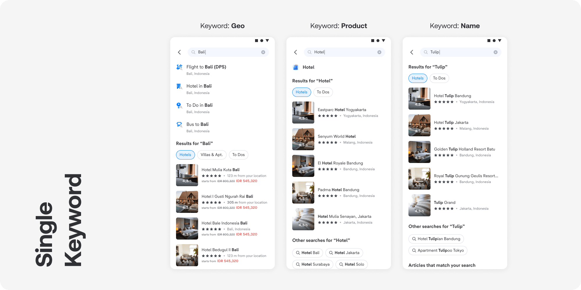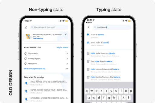 tiket.com Global Search feature (3.0 ver.) have 2 states: typing and non-typing. Both states need some work, both the functionality and the design.