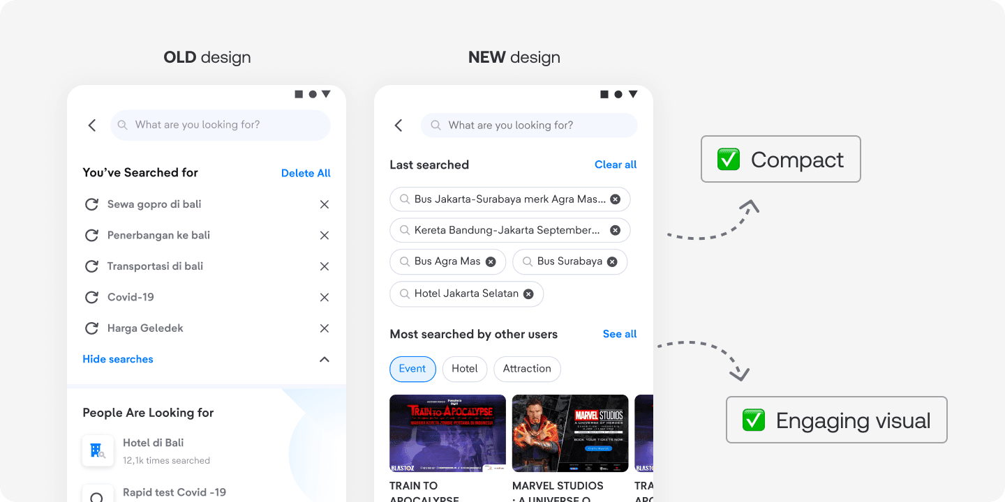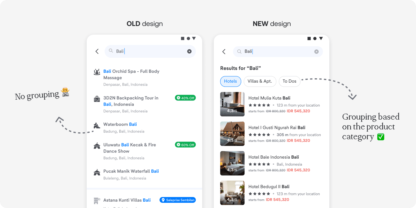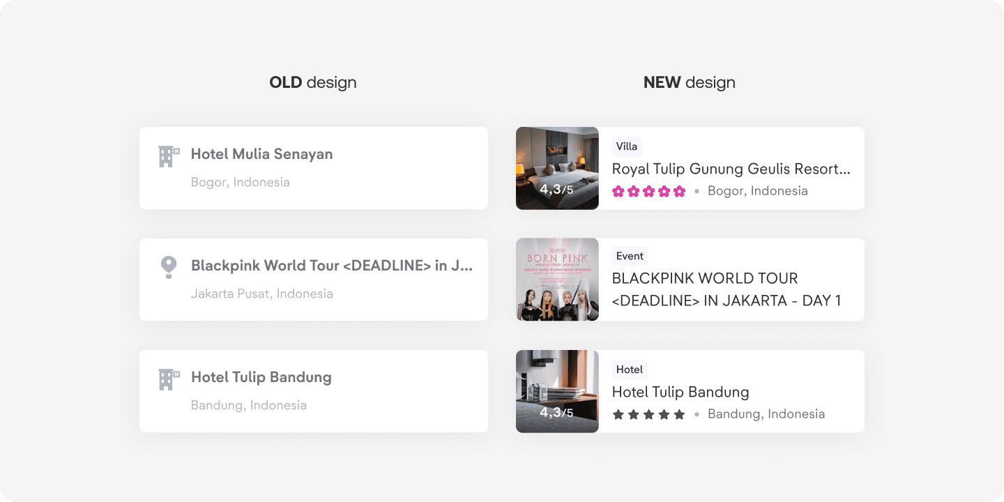 With the new information architecture, we can showcase more details—like images, star ratings, reviews, property or event type, and category—making it easier and faster for users to find what they’re looking for.